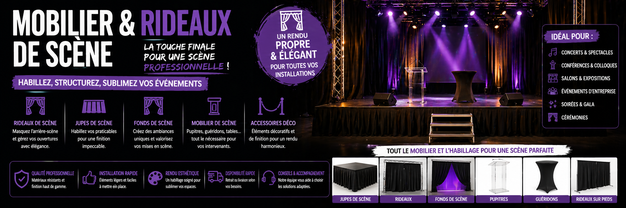 Ces solutions permettent d'habiller vos installations, de masquer les structures et d'apporter une finition professionnelle à vos scènes et espaces. Parfaits pour des concerts, des conférences, des spectacles et autres événements, nos équipements s'intègrent parfaitement à toutes les configurations.