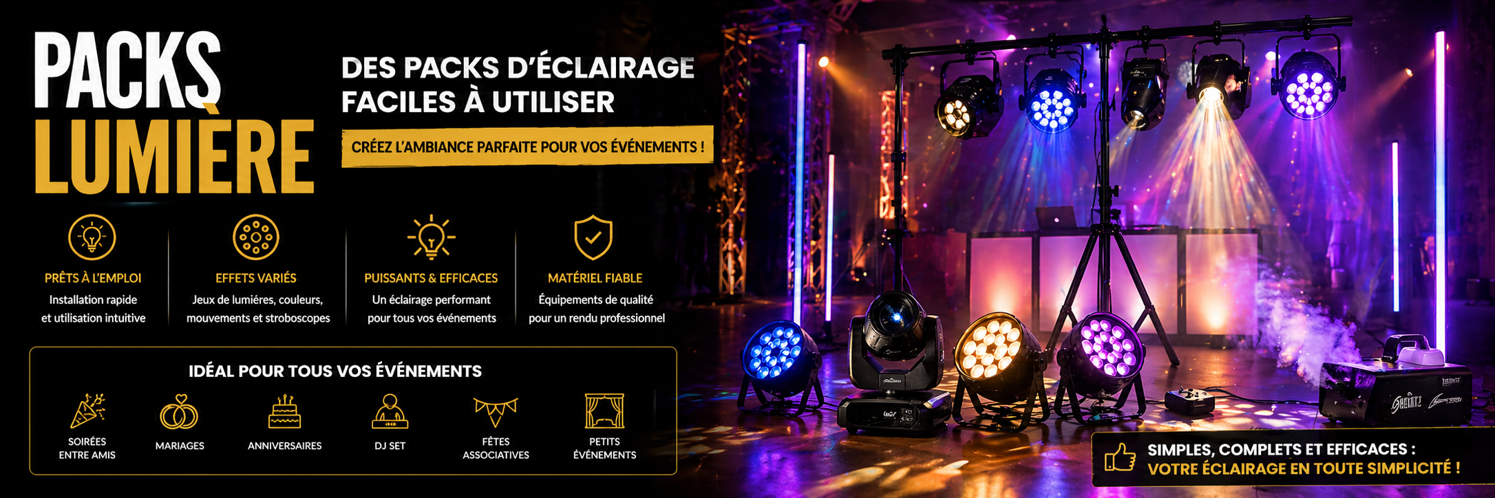 Nous proposons des packs lumière complets et simples à mettre en place, adaptés à tous types d'événements. Ces solutions regroupent projecteurs, effets lumineux et accessoires pour créer une ambiance visuelle réussie.