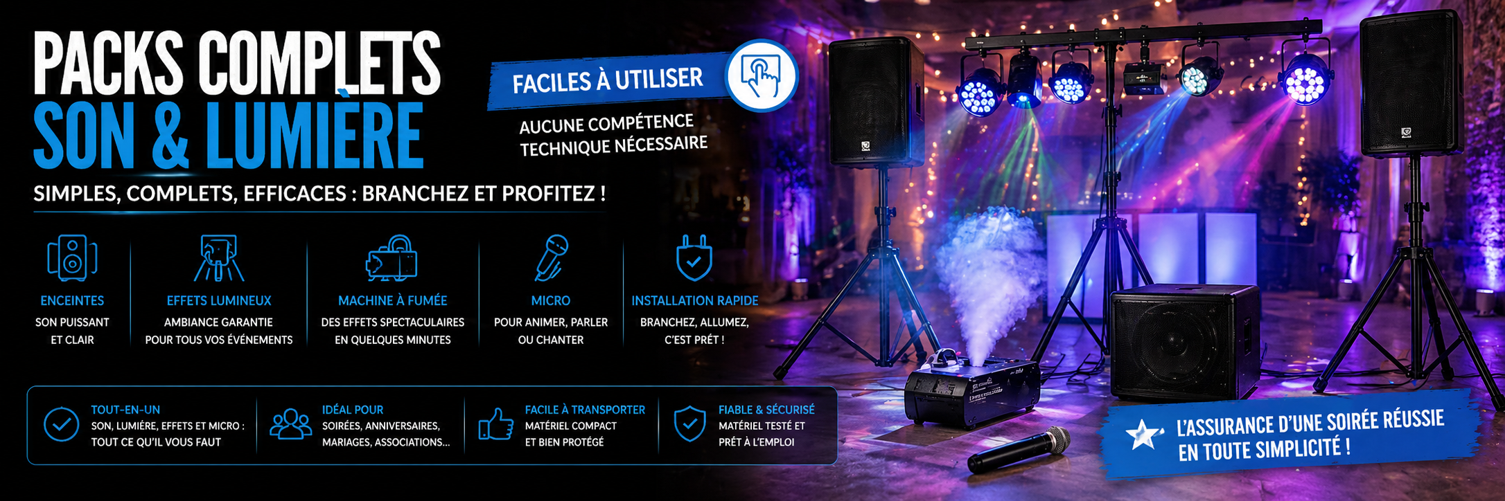 Nous proposons des packs complets son et lumière conçus pour être simples et rapides à installer. Parfaits pour les particuliers et les professionnels, ces solutions regroupent tout le matériel necessaire pour sonoriser et éclairer un événement.
