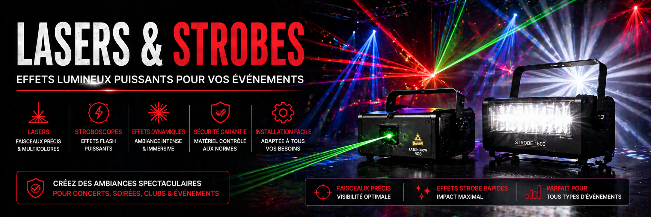 Nous proposons une gamme de lasers et stroboscopes pour vos événements : effets lumineux rapides, faisceaux laser et éclairs lumineux pour dynamiser vos prestations.