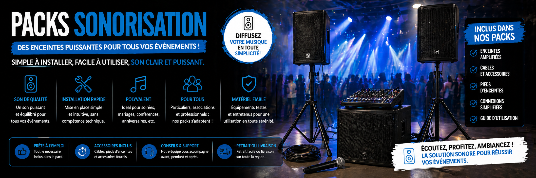 Faciles à installer et à utiliser, ces packs sont idéaux pour des soirées, des mariages, des conférences ou autres événements professionnels. Ils garantissent une diffusion sonore claire et puissante, avec une mise en place rapide et sans complexité technique.
